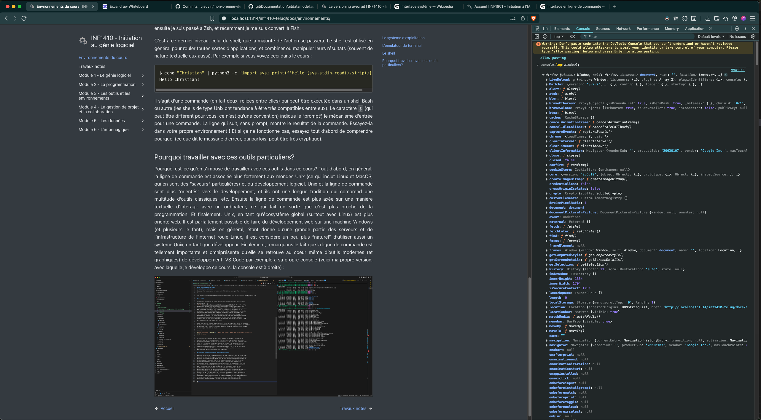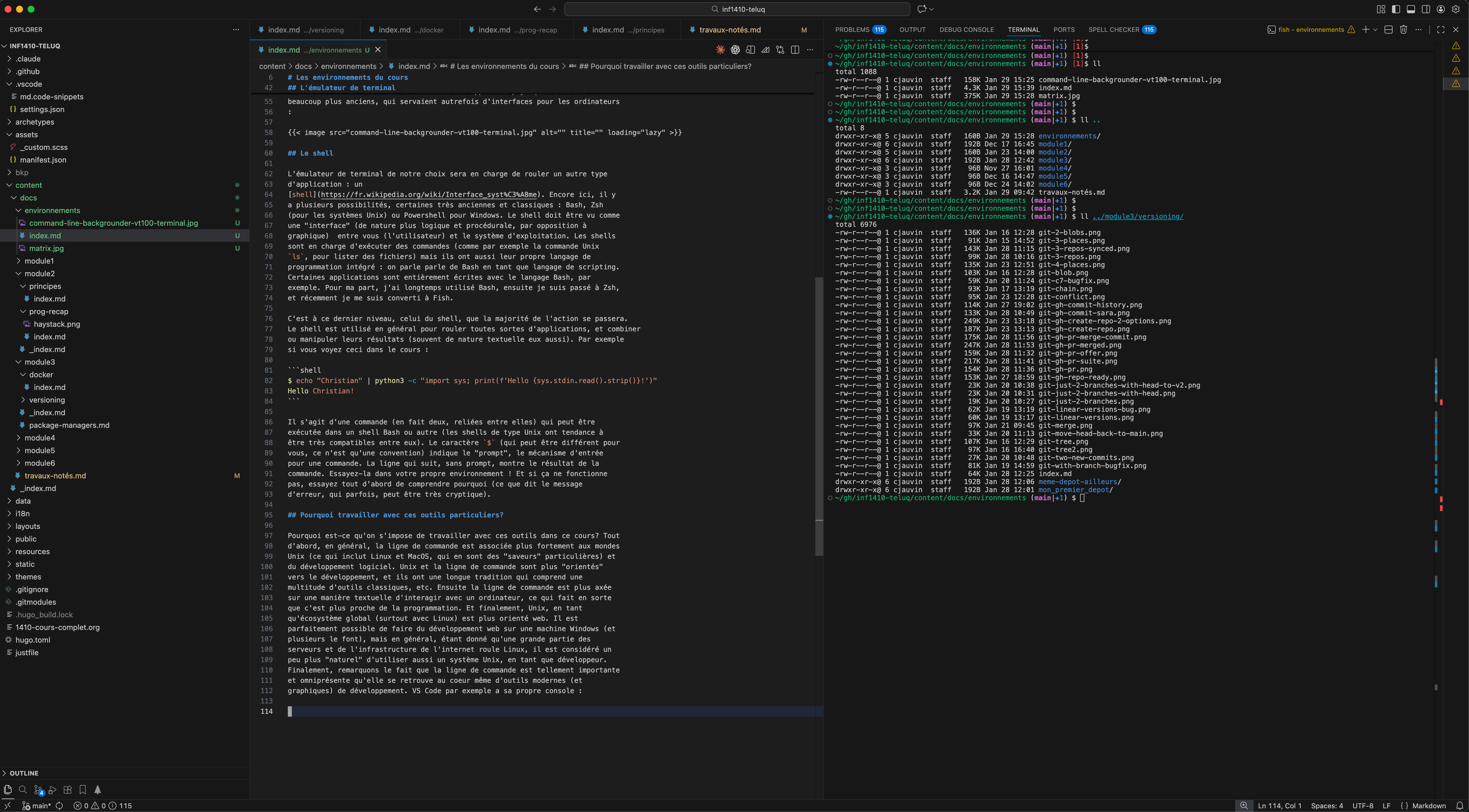 Pourquoi est-ce qu’on s’impose de travailler avec ces outils dans ce cours? Tout d’abord, en général, la ligne de commande est associée plus fortement aux mondes Unix (ce qui inclut Linux et MacOS, qui en sont des “saveurs” particulières) et du développement logiciel. Unix et la ligne de commande sont plus “orientés” vers le développement, et ils ont une longue tradition qui comprend une multitude d’outils classiques, etc. Ensuite la ligne de commande est plus axée sur une manière textuelle d’interagir avec un ordinateur, considérée généralement comme plus “proche” de la programmation. Et finalement, Unix, en tant qu’écosystème global (surtout avec Linux) est plus orienté web. Il est parfaitement possible de faire du développement web sur une machine Windows (et plusieurs le font), mais en général, étant donné qu’une grande partie des serveurs et de l’infrastructure de l’internet roule Linux, il est considéré un peu plus “naturel” d’utiliser aussi un système basé sur Unix, en tant que développeur. Finalement, remarquons le fait que la ligne de commande est tellement importante et omniprésente qu’elle se retrouve au coeur même d’outils modernes (et graphiques) de développement. VS Code par exemple a sa propre console (voici ma propre version, avec laquelle je développe ce cours, la console est à droite) :