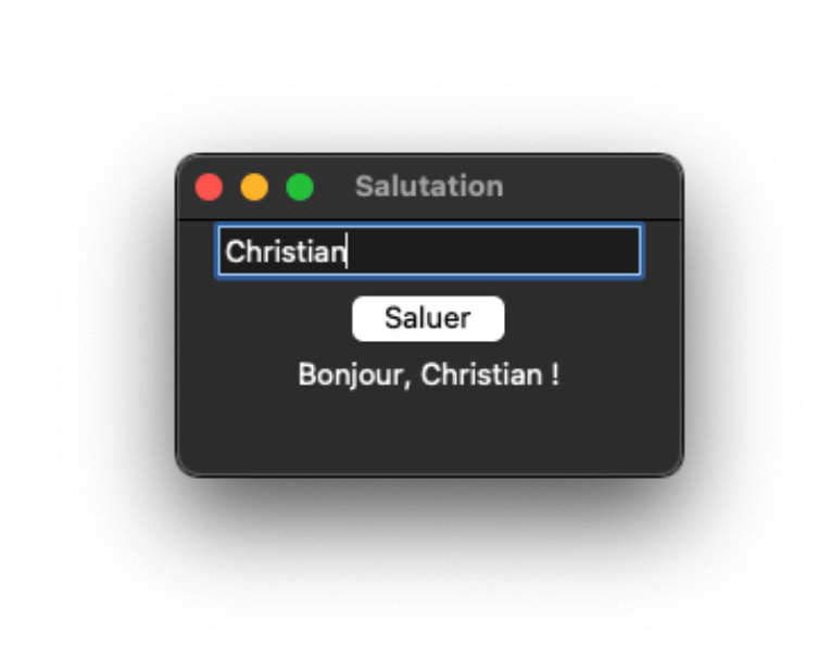 fenetre.mainloop()La différence est structurelle. Dans la version CLI, le code se lit de haut en bas. Dans la version GUI, on déclare des éléments visuels (un champ de texte, un bouton, un label), on associe une fonction callback au bouton (command=saluer), puis on cède le contrôle à mainloop(). À partir de ce moment, c’est Tkinter qui décide quand appeler saluer(), en réponse au clic de l’utilisateur sur le bouton.