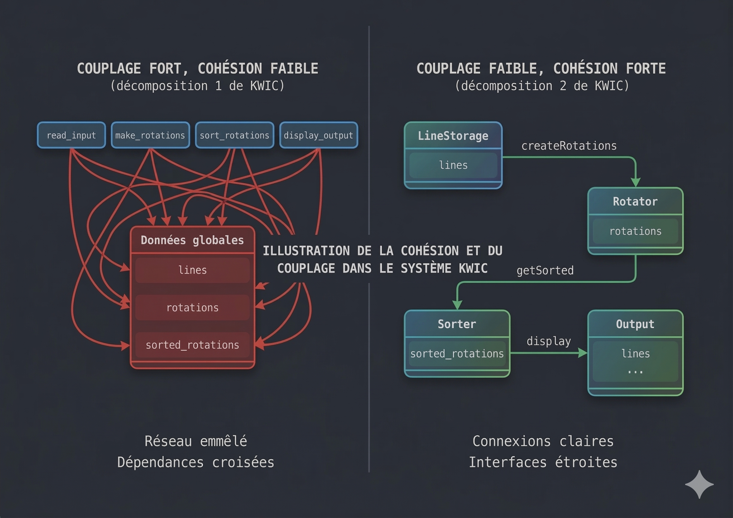Parnas propose une autre décomposition, fondée sur un principe différent : chaque module (ici ce sont des classes) doit cacher une décision de conception susceptible de changer. Au lieu de découper par étapes de traitement, on découpe par responsabilité. Le module de stockage des lignes ne sait rien du tri ; le module de rotation ne sait rien de la manière dont les lignes sont stockées. Chaque module expose une interface simple et cache ses détails internes. Parnas appelle ce principe l’information hiding (masquage de l’information).