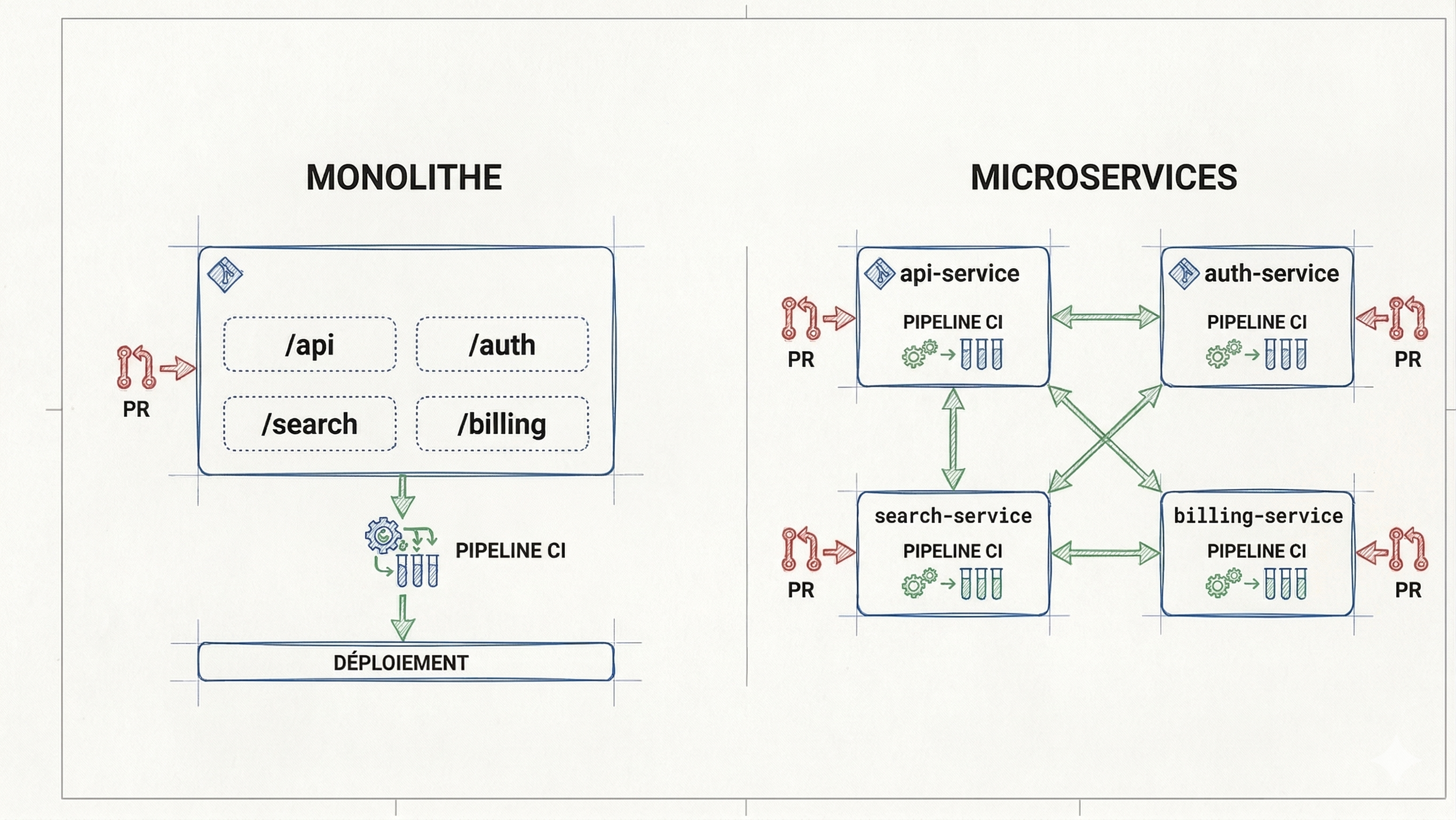Une manière concrète de penser cette distinction est en termes de dépôts git. Un monolithe vit typiquement dans un seul dépôt (un monorepo) : tout le code, tous les tests, toute la configuration dans un même endroit. Quand on passe aux microservices, chaque service a généralement son propre dépôt, avec son propre historique, ses propres pipelines de CI, et ses propres cycles de déploiement. Cette séparation est à la fois un avantage (chaque équipe est autonome sur son dépôt) et un coût (coordonner un changement qui touche plusieurs services signifie ouvrir des pull requests dans plusieurs dépôts). Certaines grandes entreprises, comme Google et Meta, font le choix inverse : un monorepo géant qui contient tout le code de l’entreprise, avec des outils spécialisés pour gérer l’échelle. Il n’y a pas de réponse universelle, mais penser en termes de dépôts aide à rendre la distinction monolithe/microservices plus tangible.