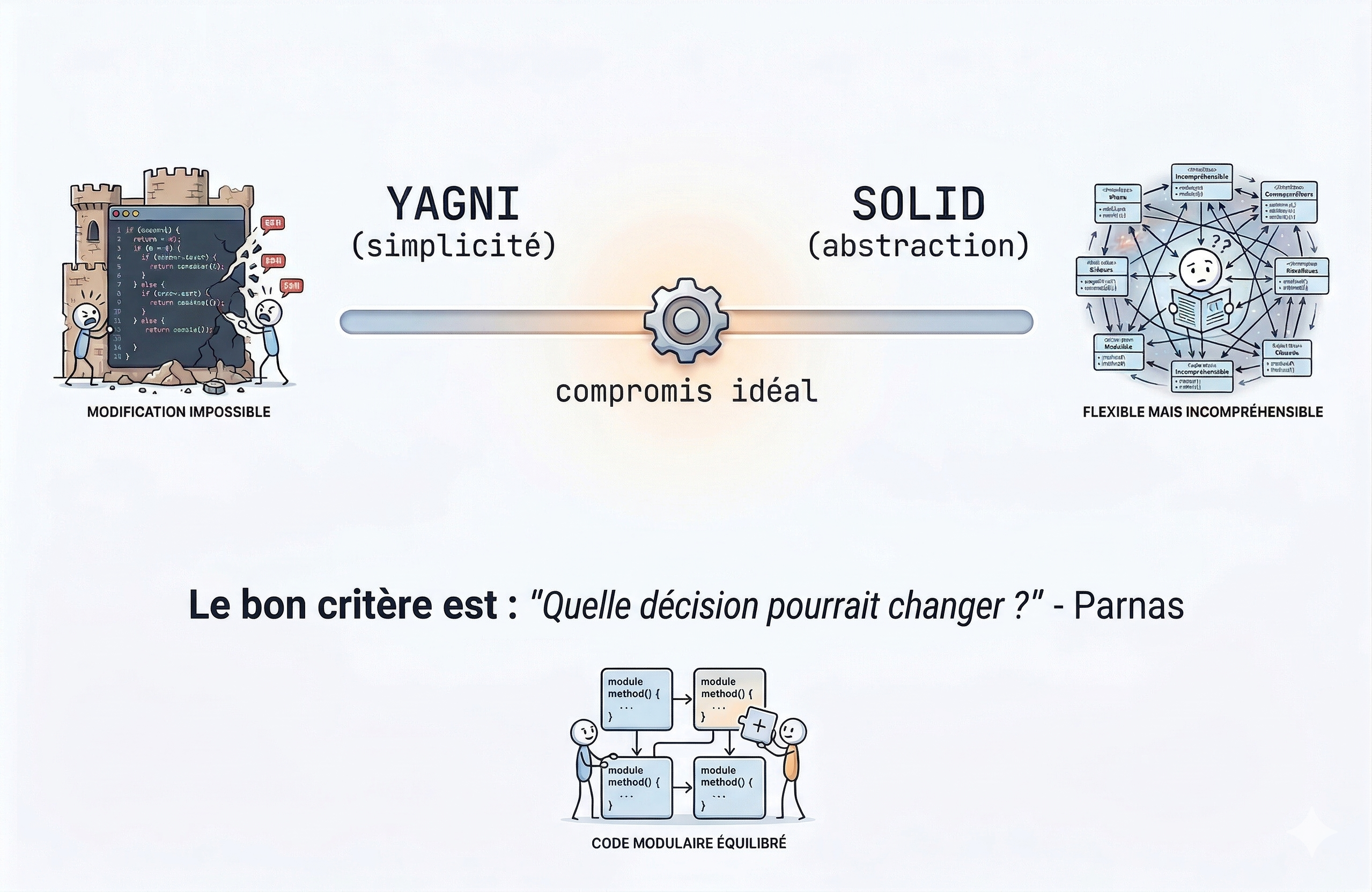 La tension entre SOLID et YAGNI est saine. SOLID pousse vers plus d’abstraction et de découpage. YAGNI pousse vers la simplicité et le pragmatisme. Un développeur expérimenté navigue entre les deux en se posant la bonne question : “est-ce que cette complexité supplémentaire résout un problème réel, ou est-ce que je me prépare à un problème imaginaire ?” Parnas nous rappelle que le bon critère de découpage est “quelle décision pourrait changer”. Si la réponse est “aucune, pour l’instant”, alors YAGNI l’emporte.