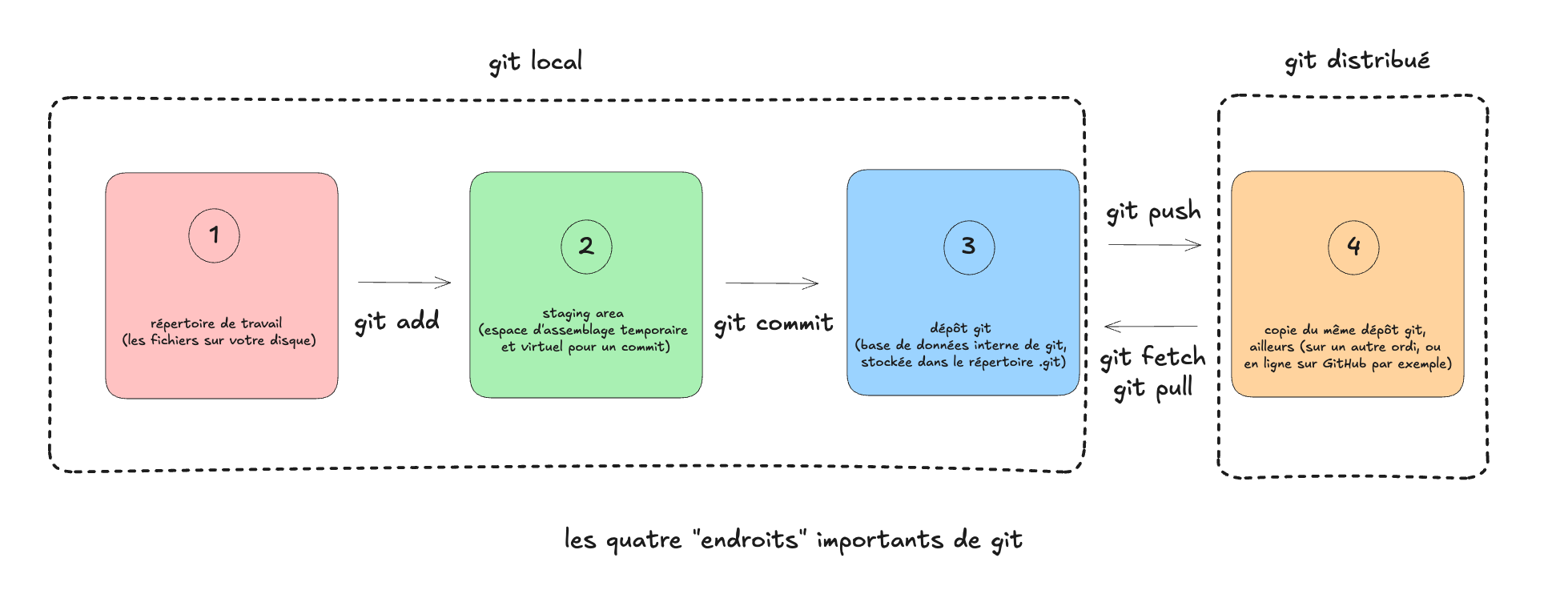 Jusqu’ici nous avons utilisé git en mode local, c’est-à-dire que la totalité des opérations que nous avons effectuées sont confinées dans le contexte particulier de notre dépôt local, dans un endroit particulier de notre disque, sur un ordinateur particulier. Mais le modèle de git est beaucoup plus puissant et général, car il permet de synchroniser des versions différentes du même dépôt, à travers le réseau internet. On dit que le modèle est distribué. Ce mode est évidemment optionnel, et il est tout à fait possible d’utiliser git de manière exclusivement locale, si ça correspond à notre besoin. Mais dans un contexte de collaboration pour le développement logiciel, le mode distribué de git est quasiment essentiel. Une bonne manière de commencer notre exploration de cette nouvelle idée est en étendant notre modèle mental des trois “endroits” du git local avec un quatrième “endroit”, qui correspond à une autre version du même depot, qui se trouve “ailleurs” :