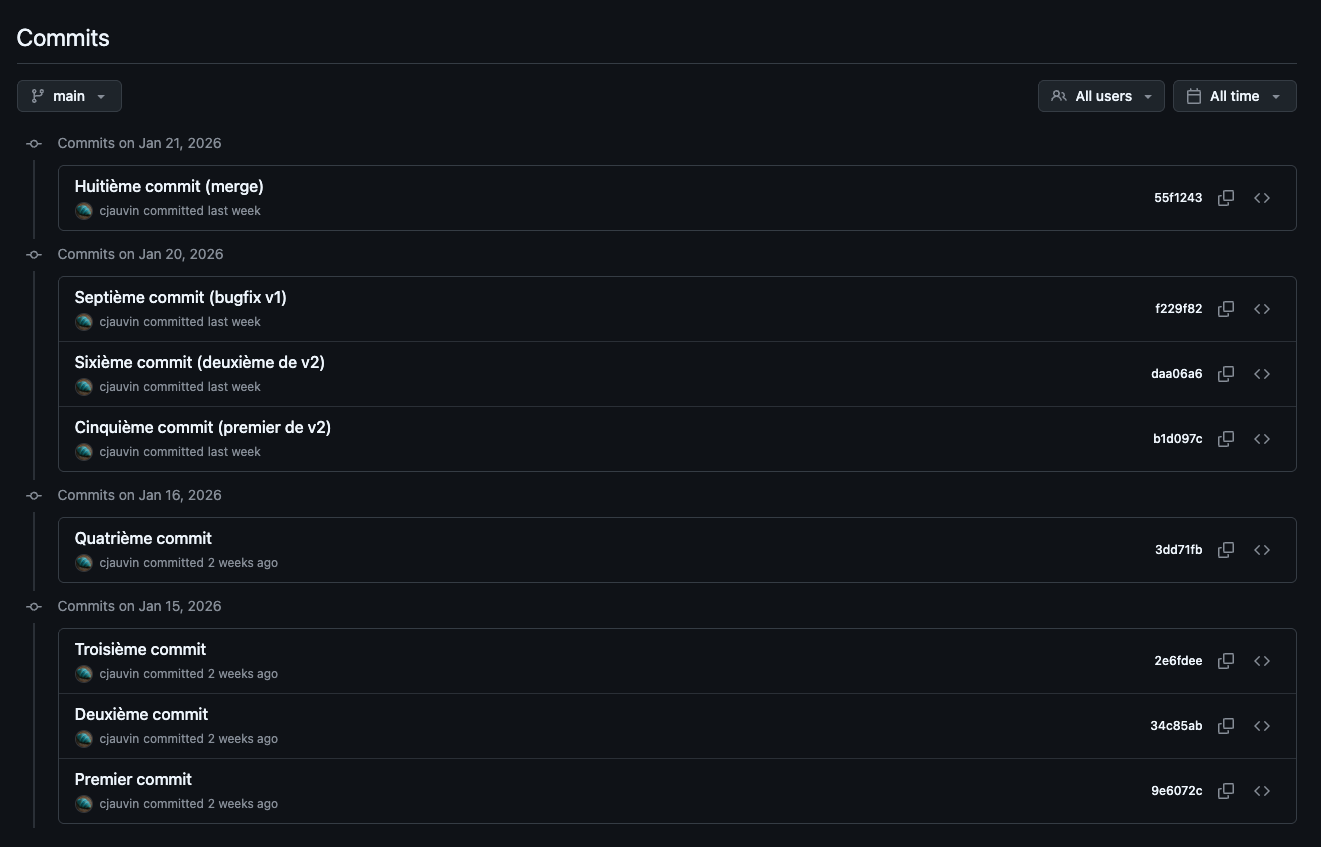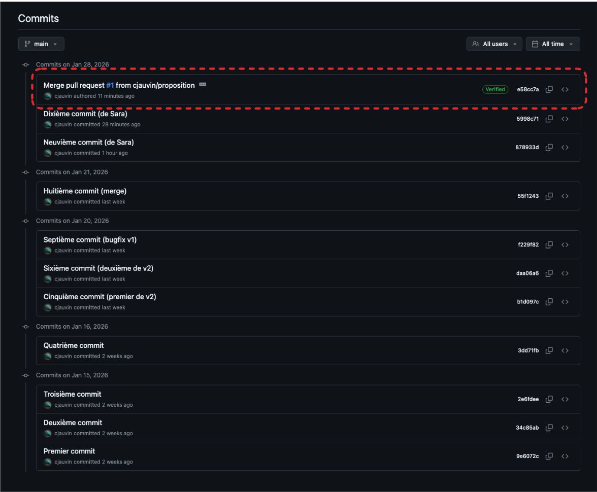 Après le merge de la PR, si on consulte la page des commits (de la branche main), on constate qu’un