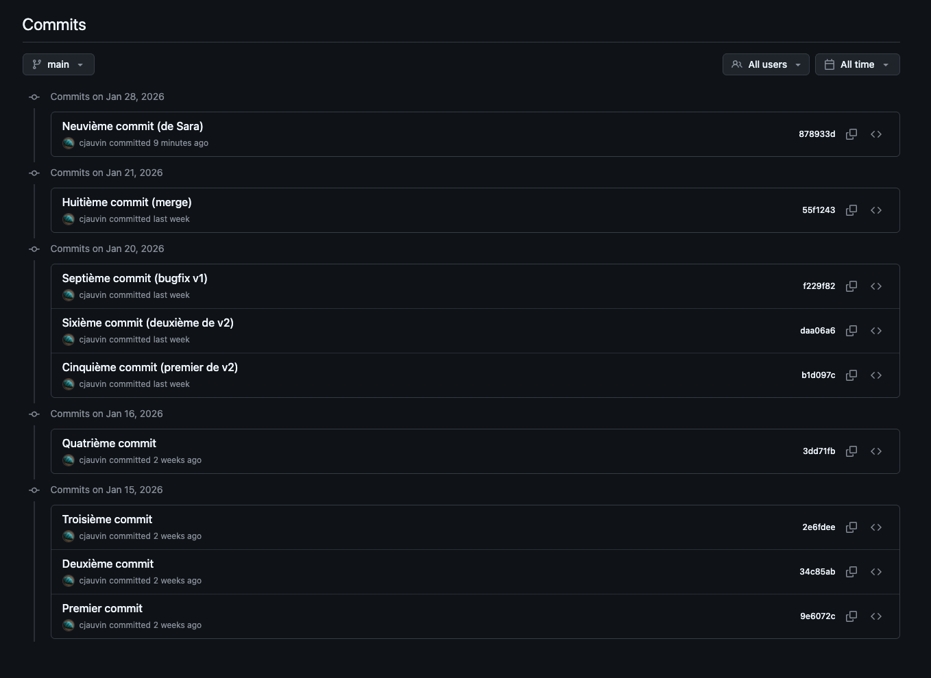 on devrait voir apparaître le commit de Sara, qu’elle vient de “pousser” (push) :