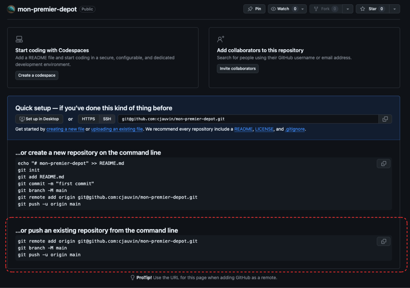 - Nous avons déjà un dépôt local existant, et nous aimerions que ce dépôt en ligne que nous venons de créer (sur GitHub) y soit associé