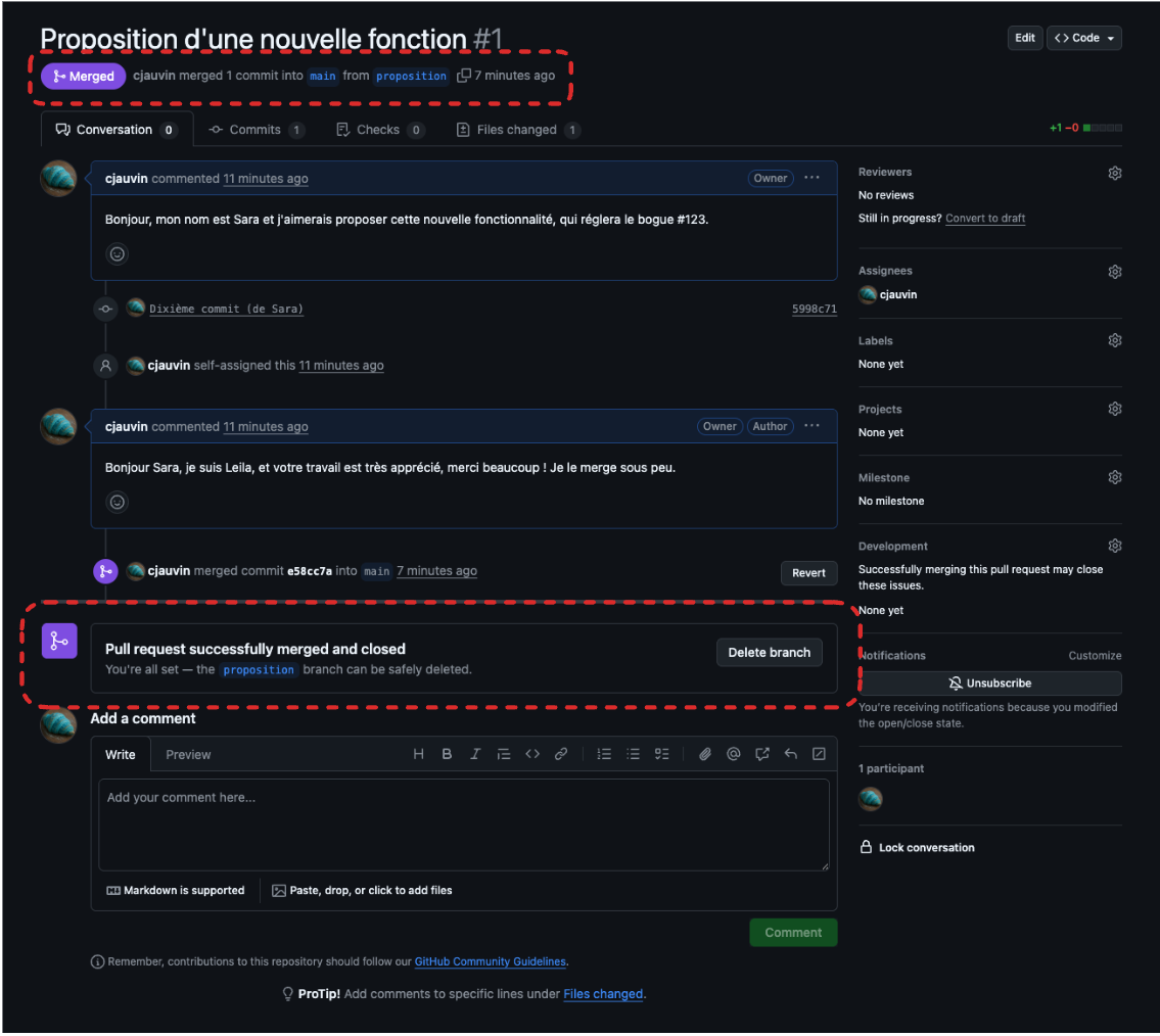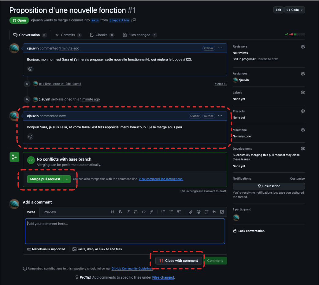 Leila pourra ensuite entrer en jeu : elle recevra la PR, pourra examiner les changements, commenter, demander des changements supplémentaires, et finalement l’accepter ou la refuser :
