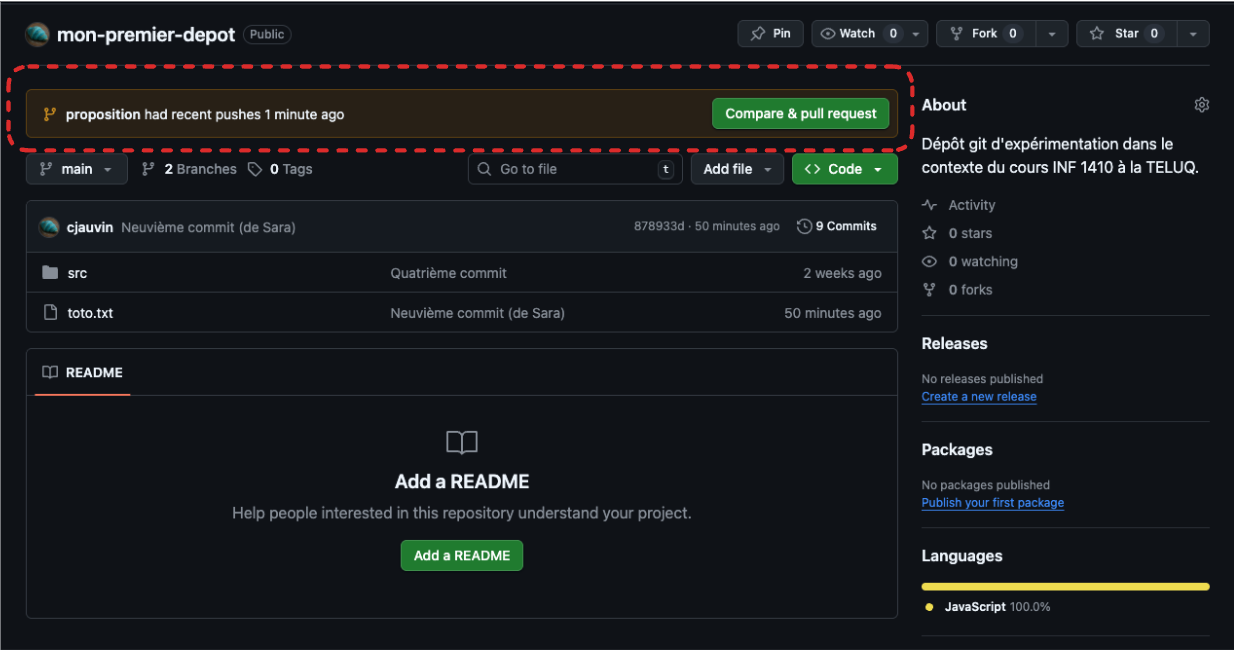 branch 'proposition' set up to track 'origin/proposition'.Après avoir fait cela, Sara devrait voir une option apparaître dans le dépôt GitHub, après l’avoir rafraîchi :