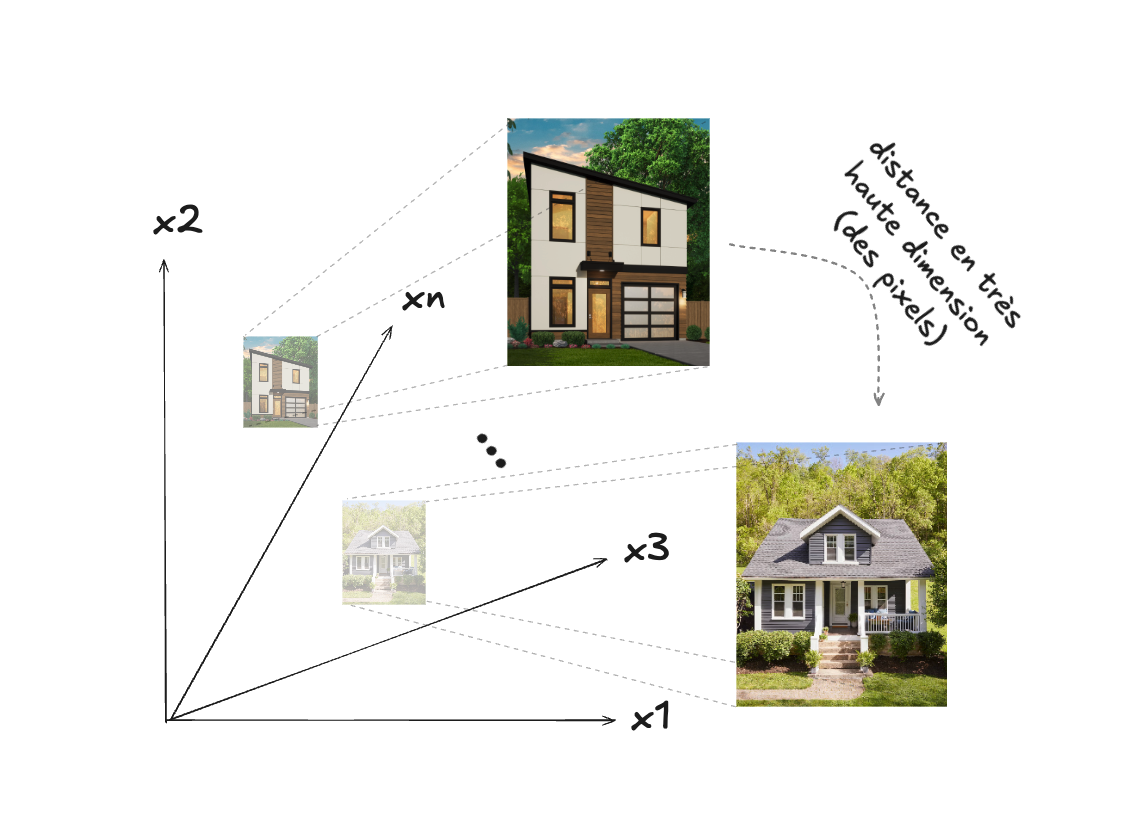 Pour d’autres types d’objets (ou de données), comme des images, par exemple, bien que cela soit plus difficile à imaginer, il faut transposer son intuition géométrique dans un espace à plus haute dimension, par exemple un espace où chaque pixel d’une image correspond à une dimension :