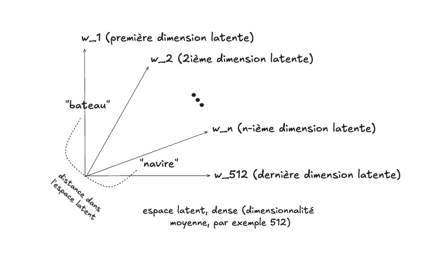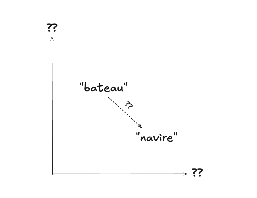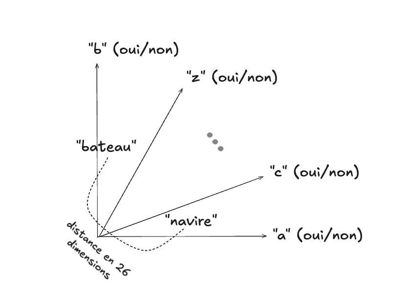 Bien que cette notion particulière de distance soit très utile pour faire des applications qui permettent par exemple de corriger des erreurs d’orthographe (ou de faire en sorte que les requêtes Google soient plus flexibles), elle est moins utile pour l’intelligence artificielle. Comment ChatGPT peut faire en sorte, par exemple, de considérer que les mots “navire” et “bateau” sont sémantiquement proches (et possiblement interchangeables), si les notions de distance que nous avons considérées jusqu’à maintenant ne permettent pas d’en offrir une mesure concrète?