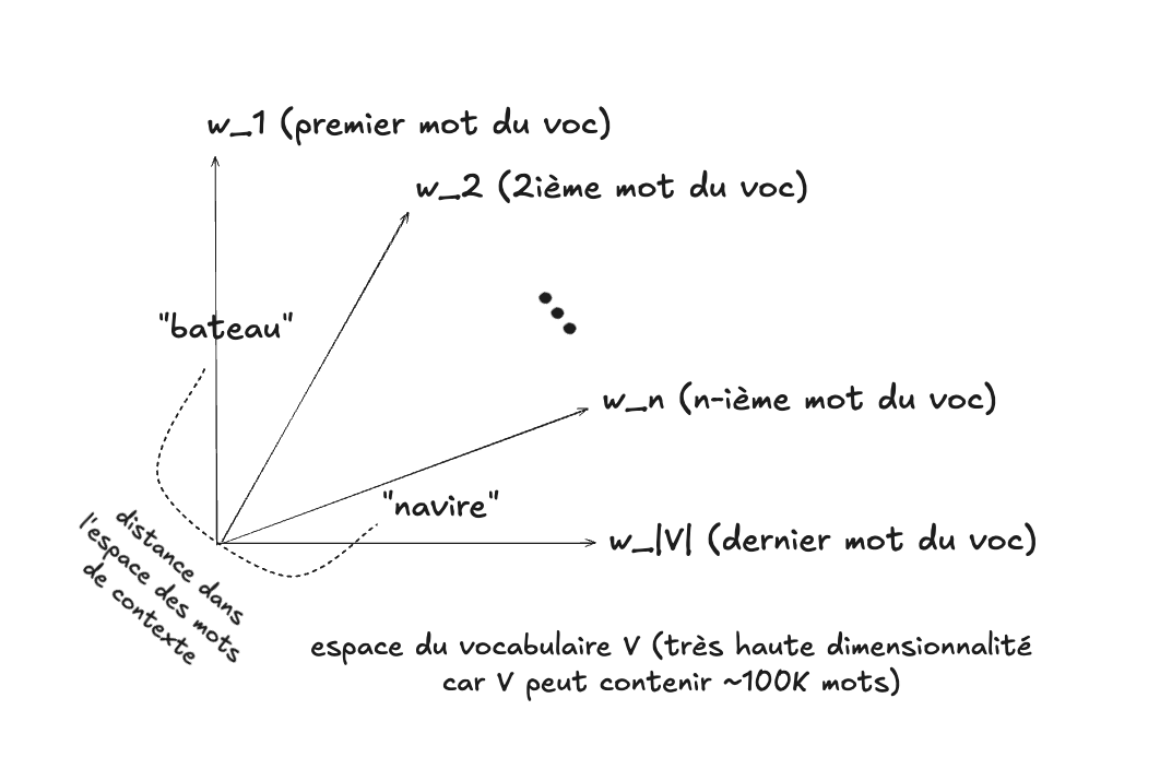 Si on y pense un peu, on se rend compte tout de suite d’un problème : les mots “navire” et “bateau” seront assez distants dans cet espace (alors qu’on voudrait qu’ils soient proches), tandis que les mots “amande” et “amende”, qu’on désirerait éloignés, seront très proches.
