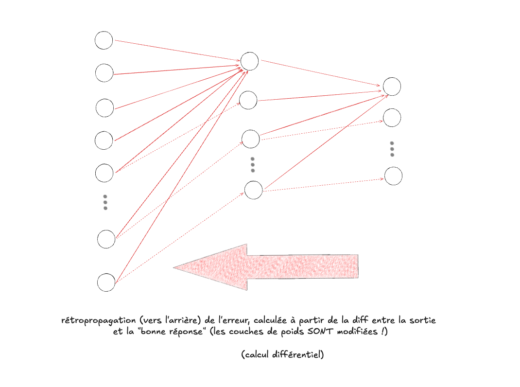 La deuxième phase commence par le calcul de “l’erreur” (c-à-d la différence entre la valeur de sortie calculée par la propagation avant, et la “bonne” valeur, celle qu’on aimerait que le réseau calcule), qui est ensuite rétropropagée vers l’arrière, afin de modifier les couches de poids. L’erreur permet de calculer le gradient, qui est la direction (un vecteur) dans laquelle sa diminution est la plus marquée. Le gradient est utilisé pour faire la modification des poids, qui sont les seuls éléments du réseau modifiés par cette phase (les données elles-mêmes ne sont évidemment pas modifiées). Si la phase de propagation avant est de l’algèbre linéaire, la phase de rétropropagation est donc du calcul différentiel.