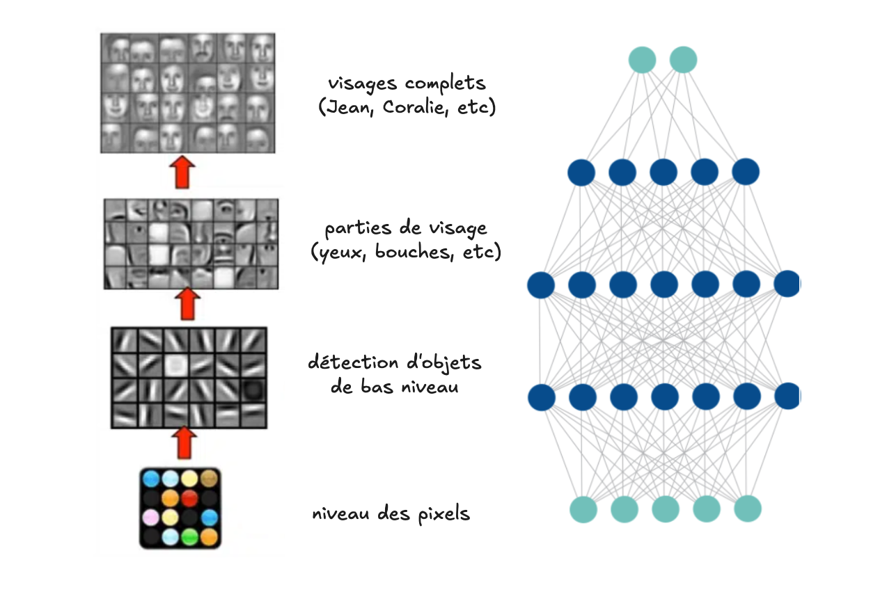 Pour comprendre l’intuition la plus fondamentale par rapport à l’apprentissage profond, il faut revenir à l’analogie avec le cerveau et la cognition. Lorsque nous percevons le monde, par exemple à travers la vision, les données brutes qui parviennent à nos yeux sont simplement des variations lumineuses projetées sur la rétine. Ces signaux sont ensuite traités dans le cerveau à travers une succession d’étapes hiérarchiques : les premiers neurones réagissent à des motifs simples (bords, contrastes, orientations), puis des couches plus profondes combinent ces motifs pour former des représentations plus complexes (formes, textures, objets spécifiques). À un niveau encore plus élevé, ces représentations se combinent pour donner lieu à des concepts abstraits, comme reconnaître un visage, une émotion ou même une idée.