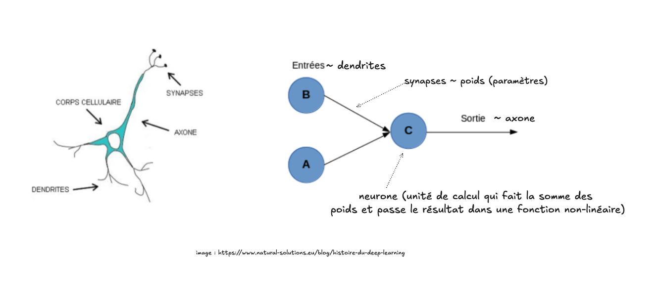 La première chose qu’on peut remarquer, c’est le changement de langage, qui nous transporte maintenant dans un domaine qui évoque plus l’intelligence : les neurones ! Il faut donc tout d’abord clarifier ce qu’on entend par neurone : il s’agit en fait d’un usage métaphorique, basé de manière très simpliste sur l’anatomie du cerveau. Voici un schéma qui aide à faire la correspondance entre les deux mondes (intelligence biologique ou artificielle) :