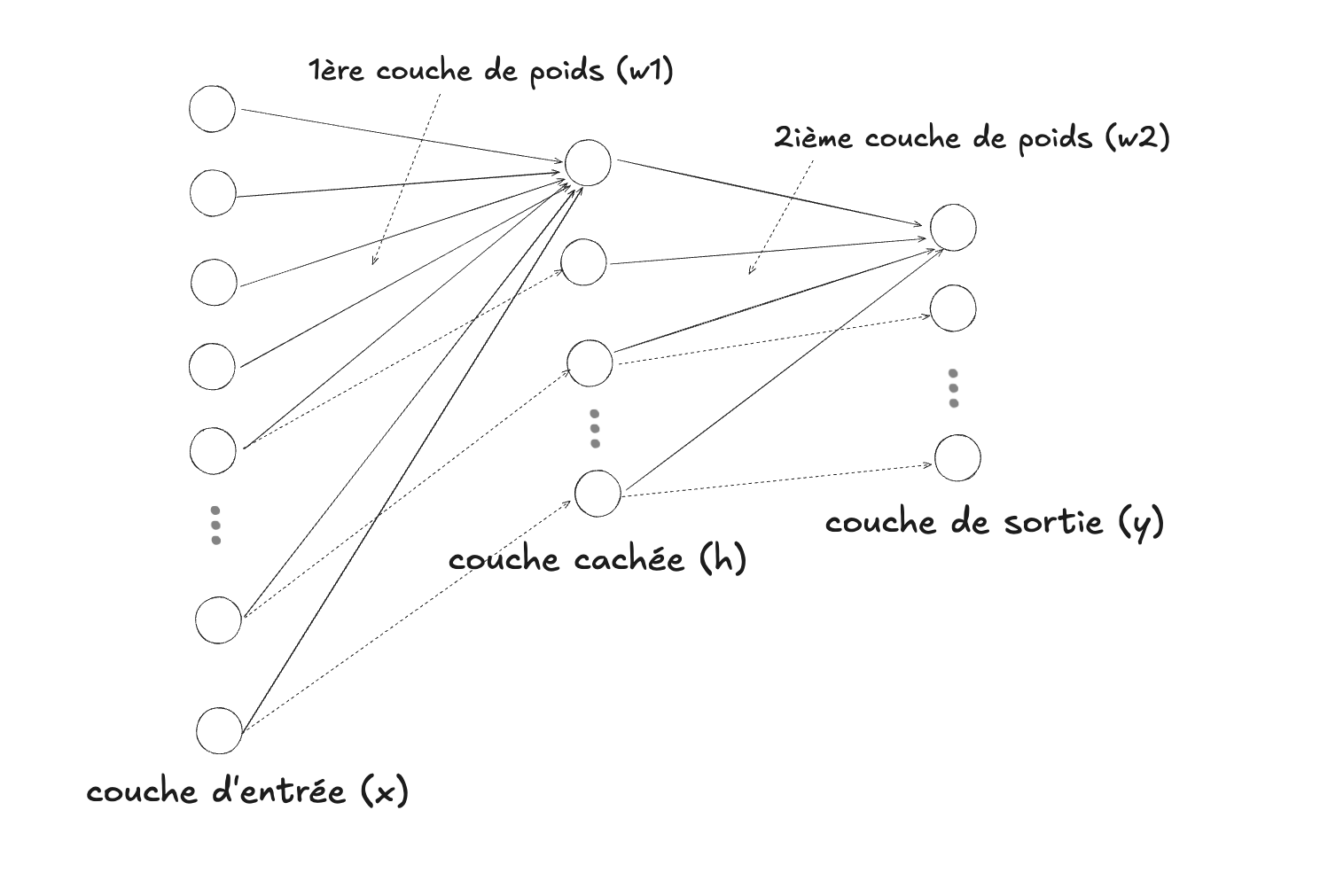 Le réseau de neurones introduit donc, par rapport à la RL, une couche intermédiaire de neurones (la couche dite cachée, entre la couche d’entrée et celle de sortie), ainsi qu’une couche de poids supplémentaire, entre la couche cachée et celle de sortie. Une autre différence est qu’il y a un nombre variable de neurones de sortie, ce qui veut donc dire que le résultat ne sera pas nécessairement un seul nombre (qu’on interprétait dans le cas de la régression logistique toujours en tant que probabilité). On peut donc considérer qu’une régression logistique est un cas spécial d’un réseau de neurones, sans couche cachée, et avec un seul neurone de sortie.