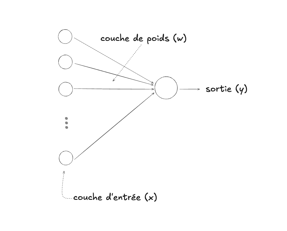 Dans nos deux diagrammes précédents (celui de la régression logistique et celui d’un réseau de neurones), la première couche (celle qui reçoit, ou connecte avec les données) n’est donc pas une couche de neurones dans le sens décrit, car elle ne contient pas ce mécanisme d’intégration. La RL a donc, par conséquent, un seul neurone au final, et un RDN plusieurs (dans la couche cachée et la couche de sortie). L’autre composante qui fait en sorte qu’il s’agit d’un réseau sont les synapses (pour le cerveau biologique) ou les poids (pour un réseau de neurones artificiels). Dans le cerveau, la transmission des signaux se fait selon un mécanisme très complexe, mais dans un RDN, les poids sont simplement des valeurs numériques, habituellement rassemblées dans une matrice : si une couche de $N$ neurones est reliée à une autre couche de $M$ neurones, il y aura donc une matrice de $N \times M$ poids pour établir la connexion.