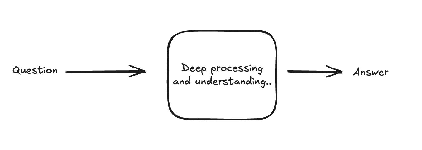 So I think that the problem that this poses is really a problem of a priori modeling : for as long as the idea of AI existed, the a priori model of language understanding (and by implication question answering) has always been : you receive a sequence of symbols (words), and then you have some kind of processing mechanism, that is in charge of “understanding” these words, that is, build some kind of (internal) representation of their meaning, whatever that “thing” might be (some internal mental model, state, or configuration, whatever). Only from that point, once you have that, can something follow (an answer, in the case of question answering), that could be first conceived, and then executed.