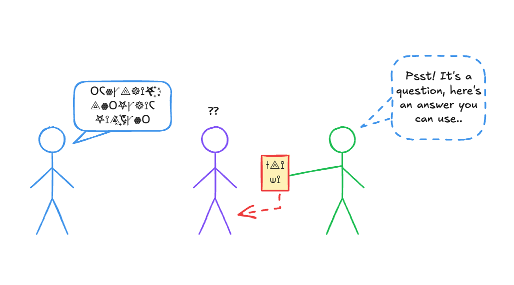 So considering that, it might seem that ChatGPT is in a situation that would be akin to you, if someone tells you a bunch of words you don’t understand (in a foreign language say) and then, someone else gives you a card, on which you can find some words to pronounce, as a reply (in a language that you don’t understand but can read, let’s say).