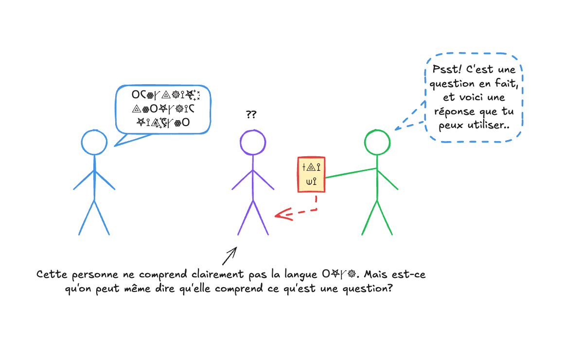 En considérant cela, on pourrait dire que ChatGPT se trouve dans une situation comparable à la vôtre si quelqu’un vous récitait une suite de mots que vous ne comprenez pas (dans une langue étrangère, disons), puis qu’une autre personne vous tendait un carton sur lequel figurent des mots à prononcer en guise de réponse (dans une langue que vous ne comprenez pas mais que vous pouvez lire, disons).