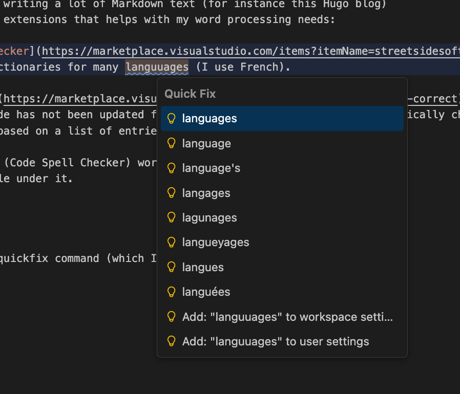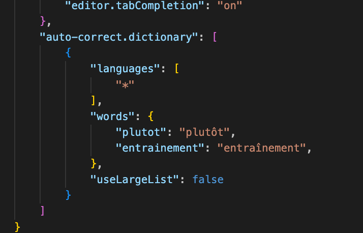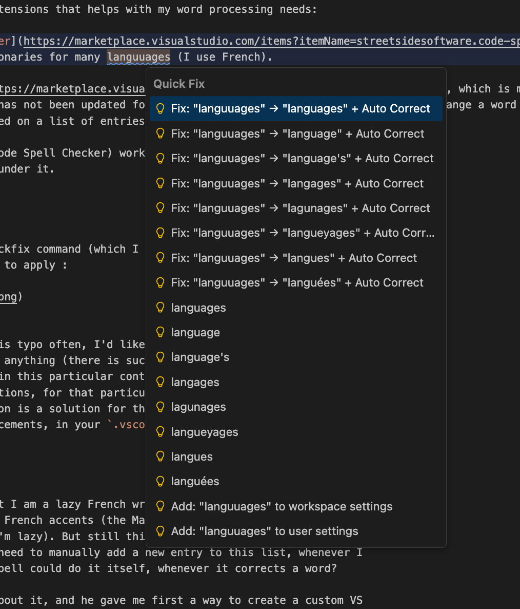 Here you can see that I am a lazy French writer, and that I prefer to not have to type the annoying French accents (it’s true that the MacOS keyboard makes this not too painful, but still I’m lazy). But still this does not satisfy fully my extreme laziness, because I need to manually add a new entry to this list, whenever I want one. What if cSpell could do it itself, whenever it corrects a word?
